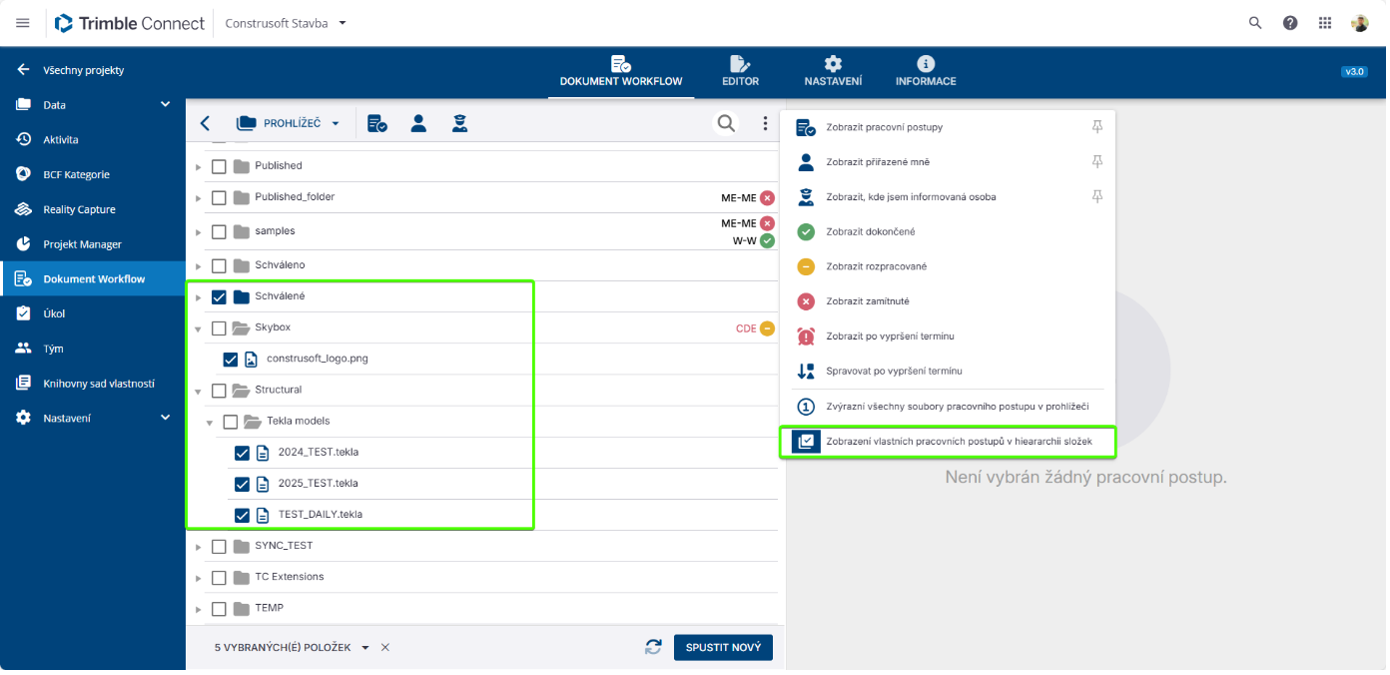 Pracovní postupy nyní lze spustit z více vybraných souborů a složek – tzv. „Vlastní pracovní postupy“. Tyto vlastní pracovní postupy lze zobrazit ve stromové struktuře složek povolením možnosti „Zobrazení vlastních pracovních postupů v hierarchii složek“ na panelu nástrojů.