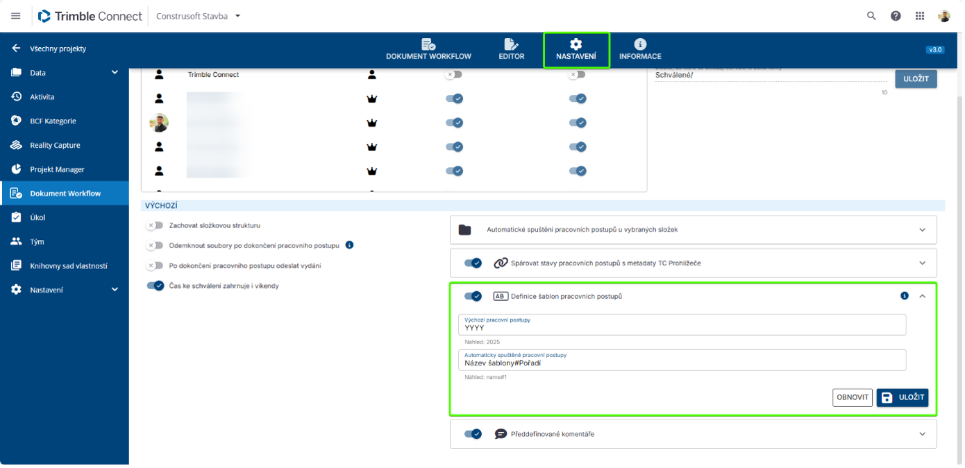 Názvy pracovních postupů jsou nyní přizpůsobitelné. V záložce Nastavení můžete definovat pravidla pojmenování pro výchozí i automaticky spouštěné pracovní postupy pomocí parametrů, jako je datum, pořadí nebo vlastní text. Navíc, jakmile je pracovní postup spuštěn, může autor název zkontrolovat a případně upravit.