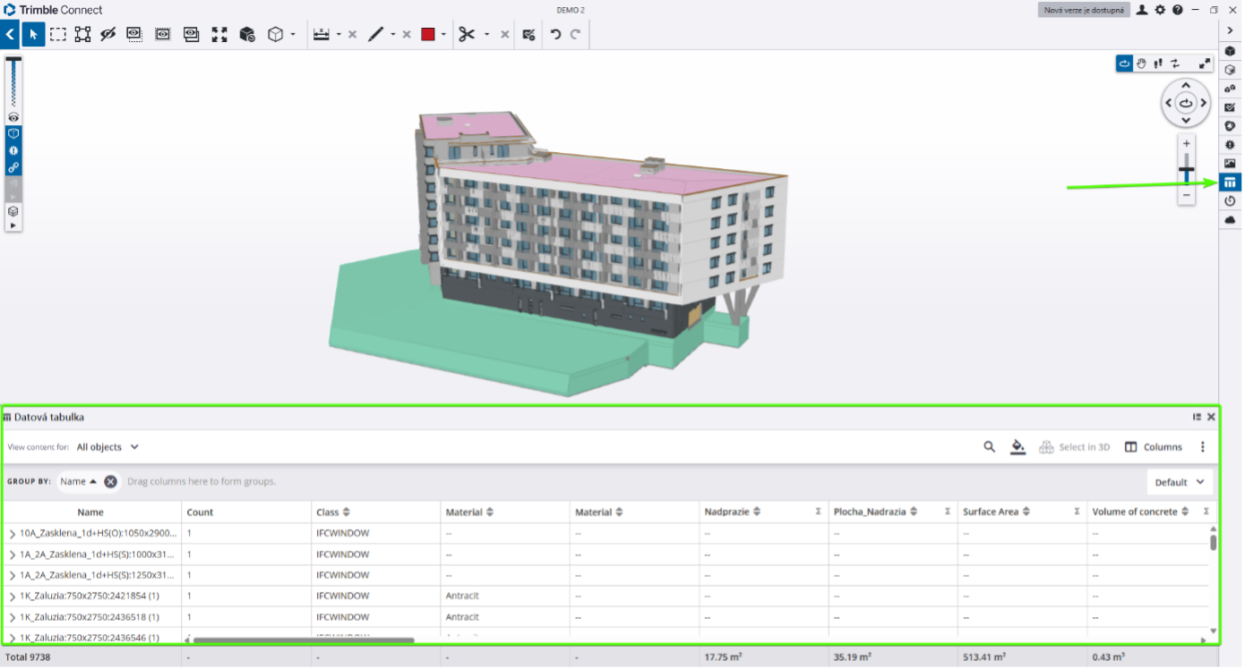 Další novinkou v desktopové verzi je možnost využití datové tabulky, která je rovněž známá z webového rozhraní. Datová tabulka umožňuje zobrazit údaje o vlastnostech jednotlivých prvků modelu v konfigurovatelné tabulce. Funkce je dostupná v online režimu desktopové aplikace.
