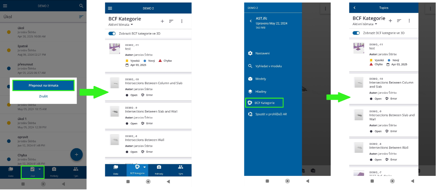 Mobilní aplikace nyní umožňuje přidávání BCF kategorií přímo z prostředí zařízení. Stačí dlouze podržet tlačítko „Úkol“ a následně přepnout na záložku Témata. Témata je navíc možné otevírat i přímo při práci v 3D prohlížeči, což výrazně zvyšuje flexibilitu a efektivitu práce v terénu.