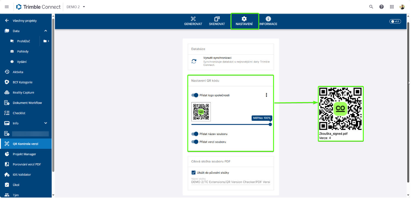 Nově lze lépe přizpůsobit QR kód, který má být přidán na dokument. Na kartě NASTAVENÍ si nyní můžete zvolit možnost mít obrázek (například firemní logo), název souboru a číslo verze souboru jako součást QR kódu. Počet znaků pro přidaný název souboru je omezen na 30 znaků (U dlouhých souborů se zobrazí prvních 13 znaků +...+ posledních 14 znaků, včetně přípony souboru).
