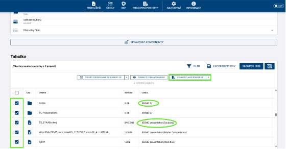 Při výběru více souborů nebo složek v Projekt Manageru je nyní dostupná možnost "Stáhnout jako ZIP." Tato funkce umožňuje stáhnout více souborů z různých projektů najednou, a to buď s původní strukturou složek projektu, nebo bez ní.