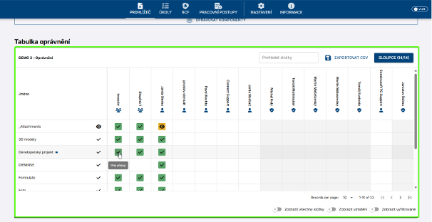 Také tabulka oprávnění prošla zásadní změnou. Administrátoři nyní mohou upravovat oprávnění ke složkám přímo v této tabulce. Ikona druhu oprávnění se zobrazuje pouze tehdy, pokud má uživatel nastavená oprávnění.