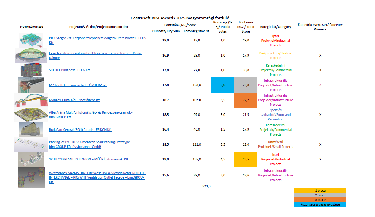 2025. május-júniusban került megrendezésre a construsoft TEKLA BIM Awards idei fordulója. Az online közönségszavazás után június 19-én, online projektbemutató keretében tíz kiváló projekt mutatkozott be a hazai szakmai zsűri előtt. A résztvevők részletesen ismertették munkáikat, bemutatva a TEKLA Structures szoftver és a Trimble Connect innovatív alkalmazását, a tervezés, modellépítés és gyártás részleteit, valamint a BIM-alapú együttműködés előnyeit. Előadásaikban színvonalas és látványos bemutatókkal kápráztatták el a BIM-szakemberekből álló zsűrit, kitérve előnyökre, sikerekre, olykor nehézségekre és egyedi műszaki megoldásokra.