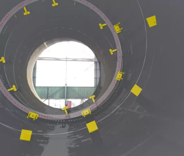 Naast de locatie in Balen heeft Smulders ook een locatie in Hoboken, waar ze transition pieces, funderingen voor offshore windturbines, produceren. Hierbij was het gebruiken van de 1:1 schaal een hele uitdaging, Reyntjens legt uit waarom: “Wij werken aan enorme projecten waarbij de stalen buizen een doorsnede kunnen hebben van wel 8 meter! Wat we hier merkten bij het uitlijnen, is dat het model perfect rond is, terwijl in realiteit de buis vervormt onder zijn eigen gewicht tot een eivorm. Wanneer je vooraan de buis manueel uitlijnt, zal een kleine afwijking op de hoek, door de grote lengte van de buis, ervoor zorgen dat deze achteraan de buis resulteert in een afwijking van enkele centimeters. Hierdoor vallen het model en het daadwerkelijke onderdeel niet meer samen.”