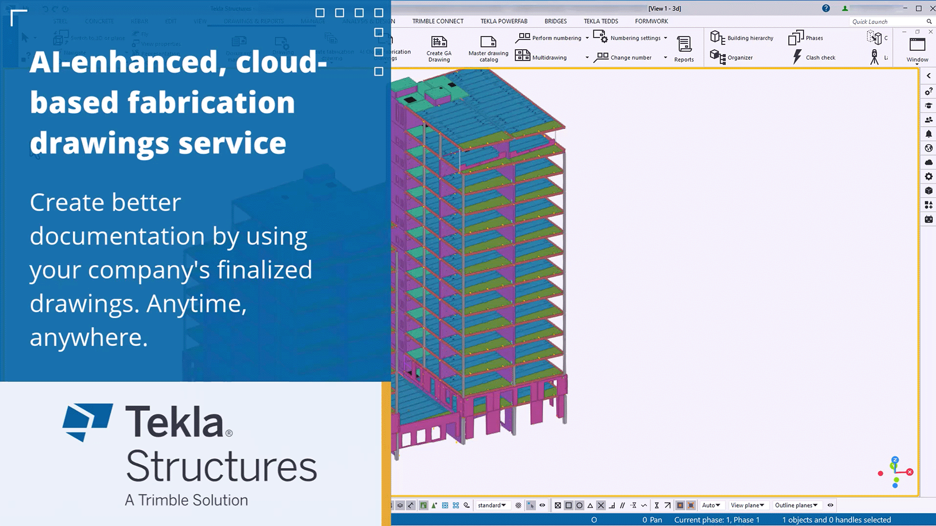 Tekla Structures 2025 biedt een preview van een AI-gedreven cloudservice die tekeningen hergebruikt op basis van een eigen database. AI helpt bij het analyseren van de inhoud, zodat de juiste tekening gekozen en gekloond kan worden.