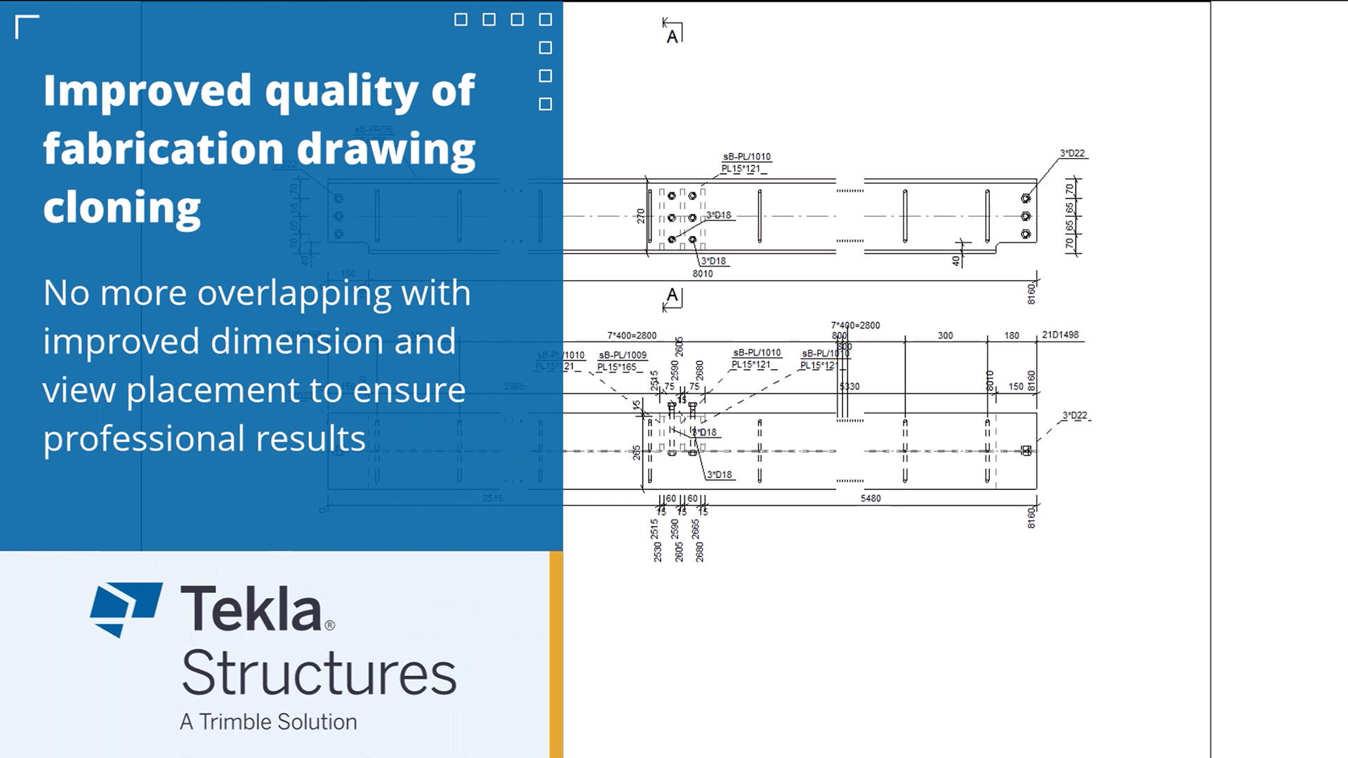 De functionaliteit SmartCreate is verbeterd. Gebruikers van Tekla Structures kunnen met de nieuwe versie nu eenvoudig de meest geschikte tekeningtemplate of het juiste bestand met tekeninginstellingen selecteren voor het genereren van elk type productietekening. Daarnaast is het klonen van productietekeningen geoptimaliseerd, waardoor aanzichten beter gepositioneerd worden en maatlijnen op logischer plekken verschijnen.