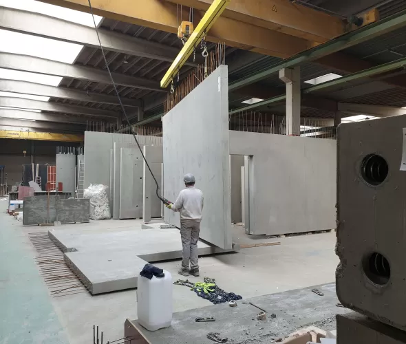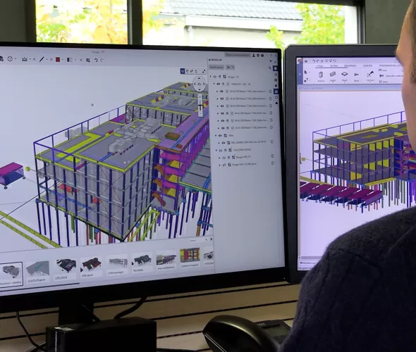 Tegenwoordig wil Vuylsteke-Eiffage bij elk project samenwerken met partners op basis van BIM. “We starten met het maken van een 3D-model, waarbij lijsten worden opgezet met vragen en issues, die anders tijdens het bouwen naar voren komen”, legt Kindt uit. “Deze wordt doorgenomen met de klant, om zoveel mogelijk clashes en tegenstrijdigheden vroegtijdig te elimineren. Als het 3D-model gereed is, wordt Tekla Structures ook ingezet voor de opmaak van productietekeningen. Deze tekeningen gebruiken we voor de productie van prefab elementen, zoals kolommen, balken en wanden, in onze eigen prefab-afdeling. Daarnaast wordt het model ook gedeeld met de leveranciers, die op basis van ons gedetailleerde 3D-model al kunnen plannen, wat voor enorme tijdswinst zorgt. Zij hoeven niet te starten met basisplannen, waar mogelijk fouten in zitten, maar kunnen direct starten met een correct 3D-model. Hierdoor verloopt de doorlooptijd van controles eenvoudiger. De voorbereiding vraagt wat meer tijd, maar zorgt uiteindelijk voor vele voordelen bij het totale productieproces.”